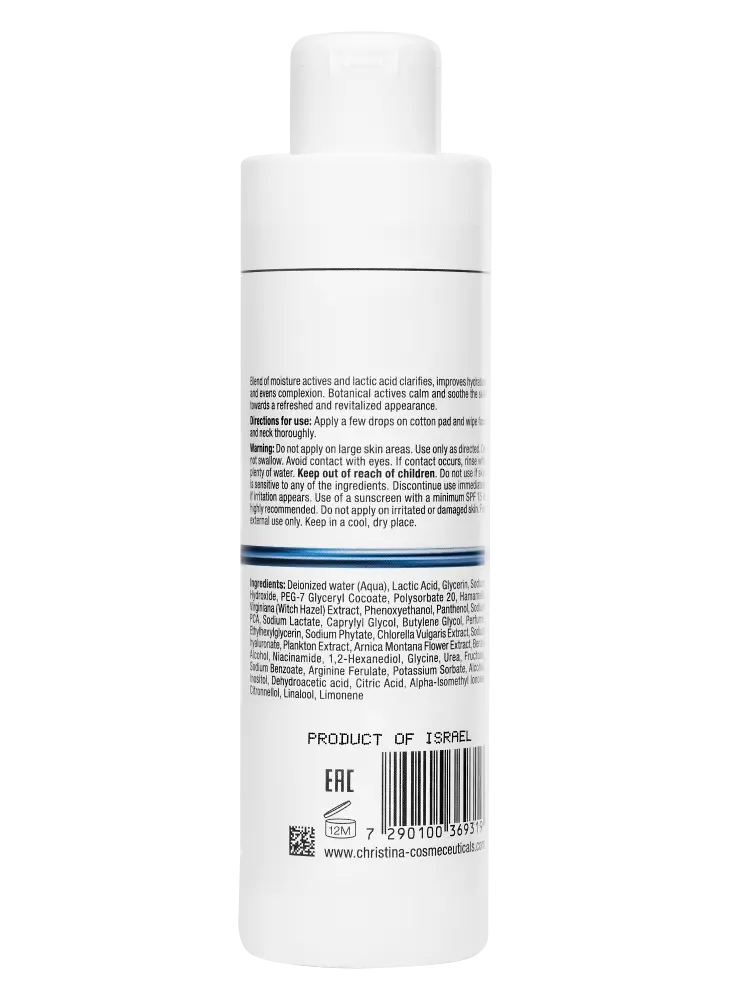Ein klärendes, feuchtigkeitsspendendes Gesichtswasser mit 6 % Milchsäure, pflanzlichen Extrakten und natürlichen Feuchtigkeitsspendern, das die Hautstruktur verfeinert, den Teint ausgleicht und die Hydration unterstützt. Die Haut wirkt erfrischt und ausbalanciert. Ideal für ein glatteres, strahlenderes Hautbild.